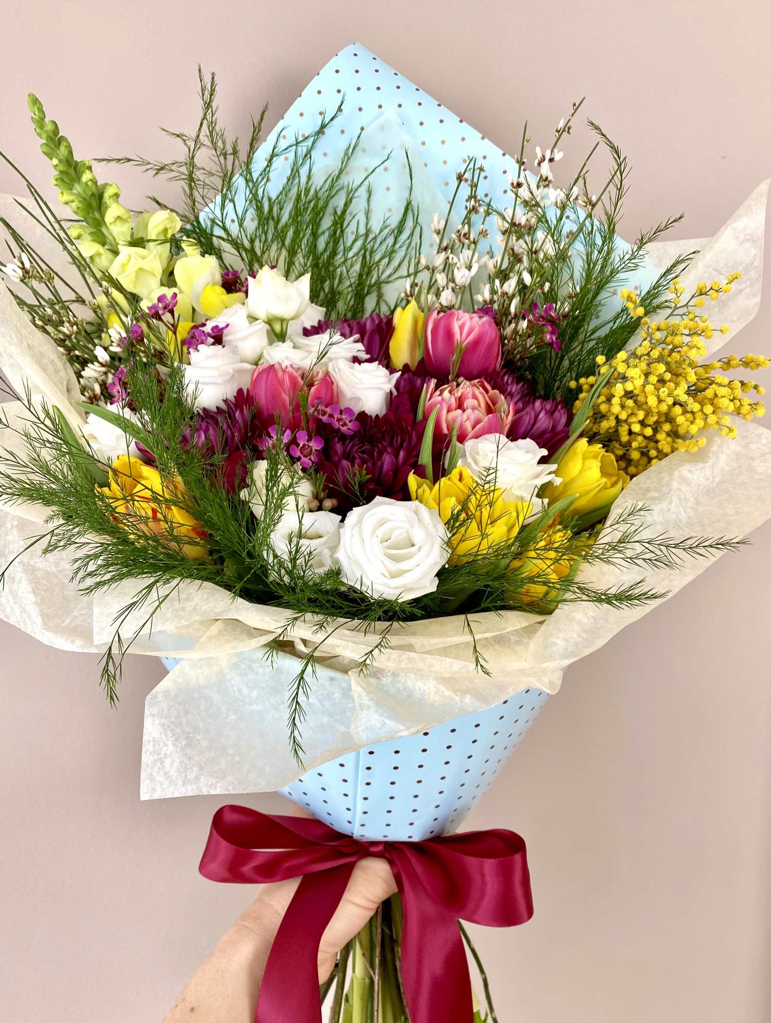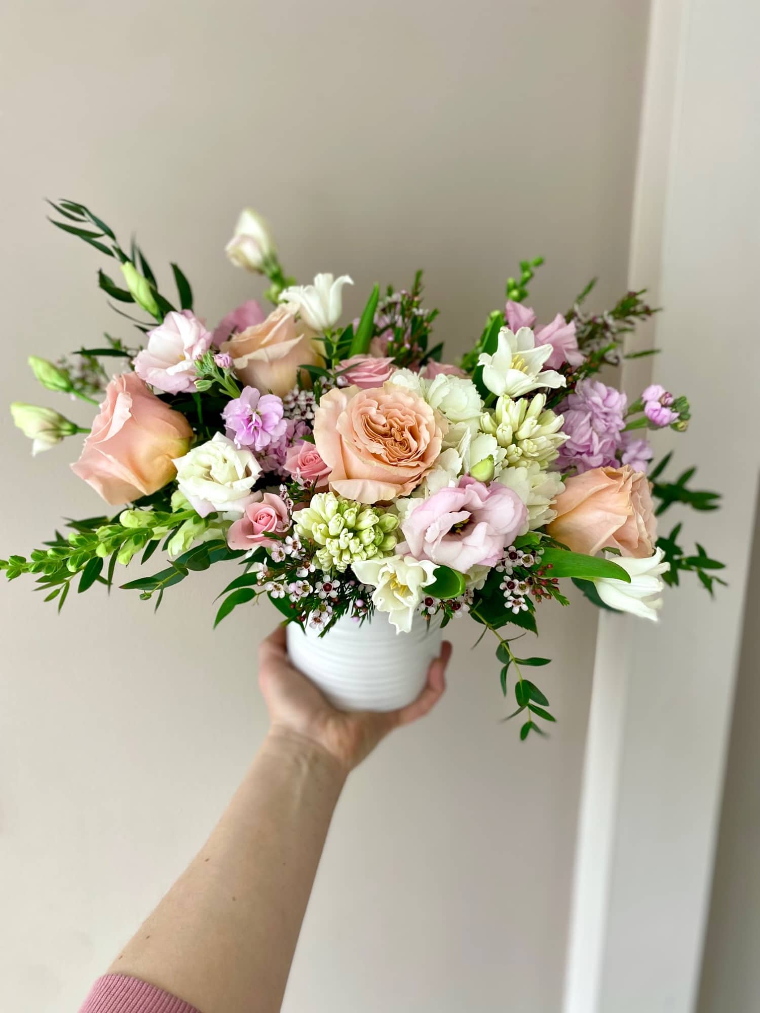 Choose the style of the arrangement - Hand-tied OR Custom-arranged in a vase.